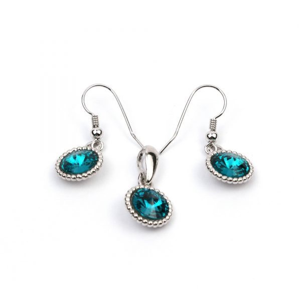 Setul este format din: cercei care sunt realizati din tortite clasice de argint 925 rodiate, sistem prindere pandant de argint 925, cristale Swarovski rivoli light sapphire de 8 mm, avand dimensiunea 28 x 10 mm. Pandantul are dimensiunea de 20×10 mm. Setul se livreaza intr-o cutie de bijuterii cadou.