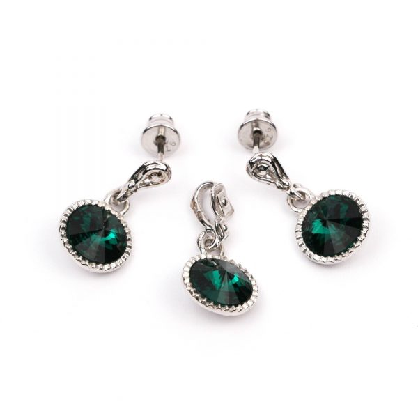 Setul este format din cercei care sunt realizati din tortite cu pin de argint 925 rodiate, sistem prindere de argint 925, cristale Swarovski rivoli verde smarald de 8 mm, avand dimensiunea 20 x 10 mm. Pandantul are dimensiunea de 20×10 mm. Setul se livreaza intr-o cutie de bijuterii cadou.
