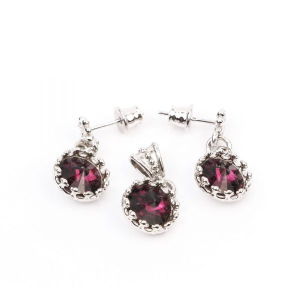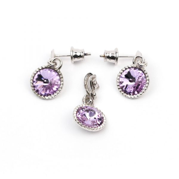 Setul este format din cercei care sunt realizati din tortite cu pin de argint 925 rodiate, sistem prindere de argint 925, cristale Swarovski rivoli violet de 8 mm, avand dimensiunea 20 x 10 mm. Pandantul are dimensiunea de 20×10 mm. Setul se livreaza intr-o cutie de bijuterii cadou.
