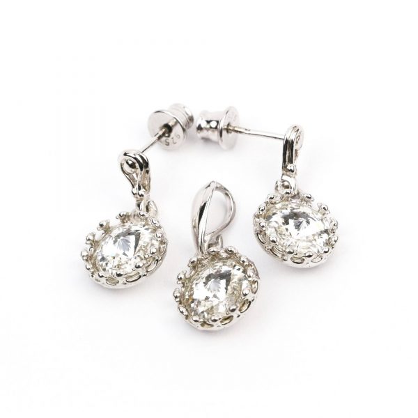 Setul este format din cercei care sunt realizati din tortite clasice de argint 925 rodiate, sistem prindere de argint 925, cristale Swarovski rivoli crystal de 8 mm, avand dimensiunea 30 x 10 mm. Pandantul are dimensiunea de 20×10 mm. Setul se livreaza intr-o cutie de bijuterii cadou.