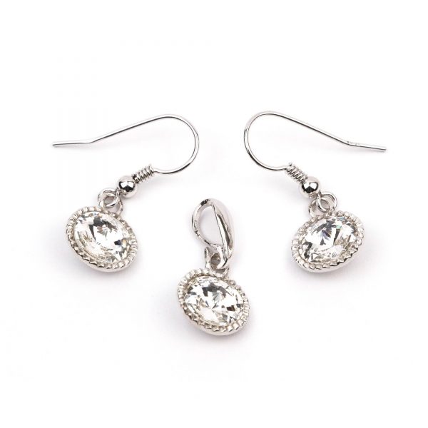 Setul este format din cercei care sunt realizati din tortite cu pin de argint 925 rodiate, sistem prindere de argint 925, cristale Swarovski rivoli crystal de 8 mm, avand dimensiunea 20 x 10 mm. Pandantul are dimensiunea de 20×10 mm. Setul se livreaza intr-o cutie de bijuterii cadou.