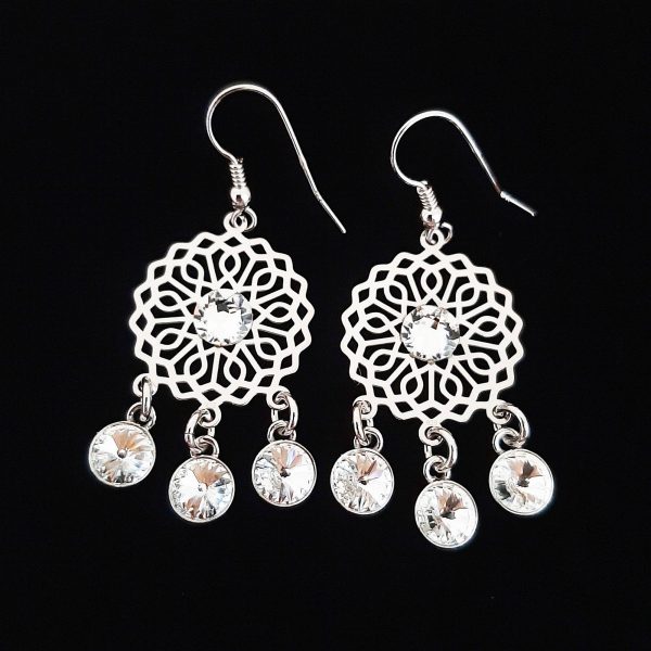 Cerceii sunt realizati din tortite clasice de argint 925 rodiate, candelabru de argint925 rodiat si ornamente argint, cristale Swarovski rivoli crystal de 6 mm, avand dimensiunea 50 x 20 mm. Cerceii se livreaza intr-o cutie de bijuterii cadou.