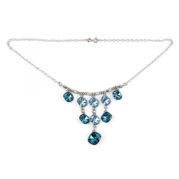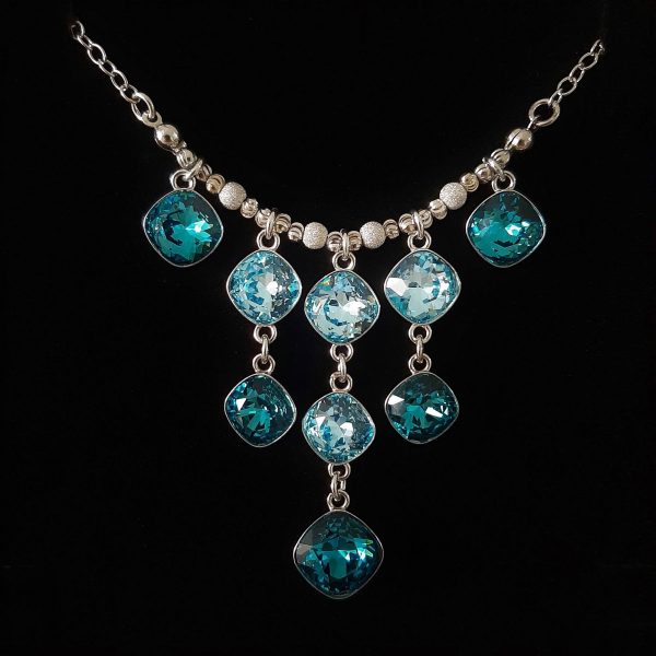 Colierul este realizat manual din lant si ornamente de argint 925 rodiate, cristale Swarovski patrate de 10 si 12 mm de culoare aquamarine si indicolite, lungimea colierului este de 42 cm. Colierul se livreaza intr-o cutie de bijuterii cadou.
