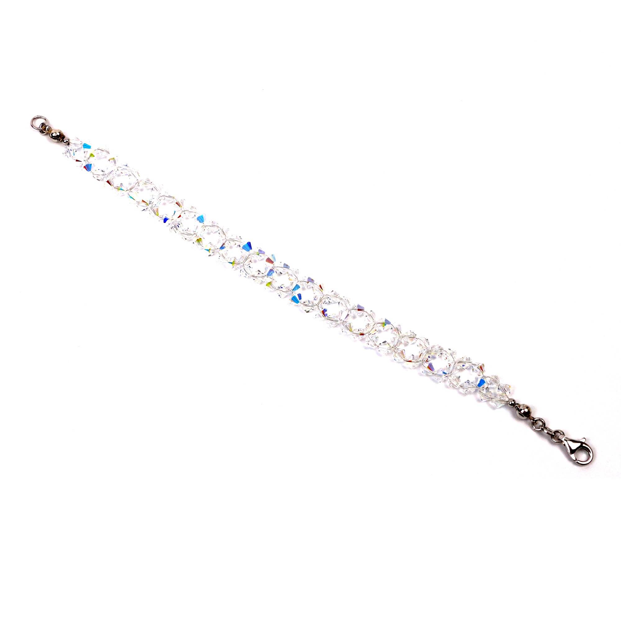 Bratara este realizata din elemente de argint 925 placate cu rodiu si cristale Swarovski margele biconice crystal aurore boreala de 4mm, avand dimensiunea de 19.5cm . Bratara se livreaza intr-o cutie de bijuterii cadou.