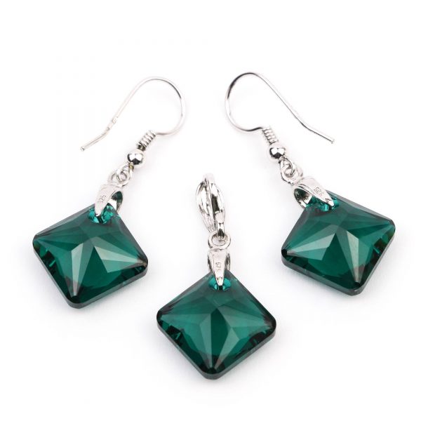 Setul este format din: cercei care sunt realizati din tortite clasice de argint 925 rodiate, sistem prindere de argint 925, cristale Swarovski Princess cut verde smarald de 16 mm, avand dimensiunea 37 x 16 mm. Pandantul are dimensiunea de 30x16 mm. Setul se livreaza intr-o cutie de bijuterii cadou.