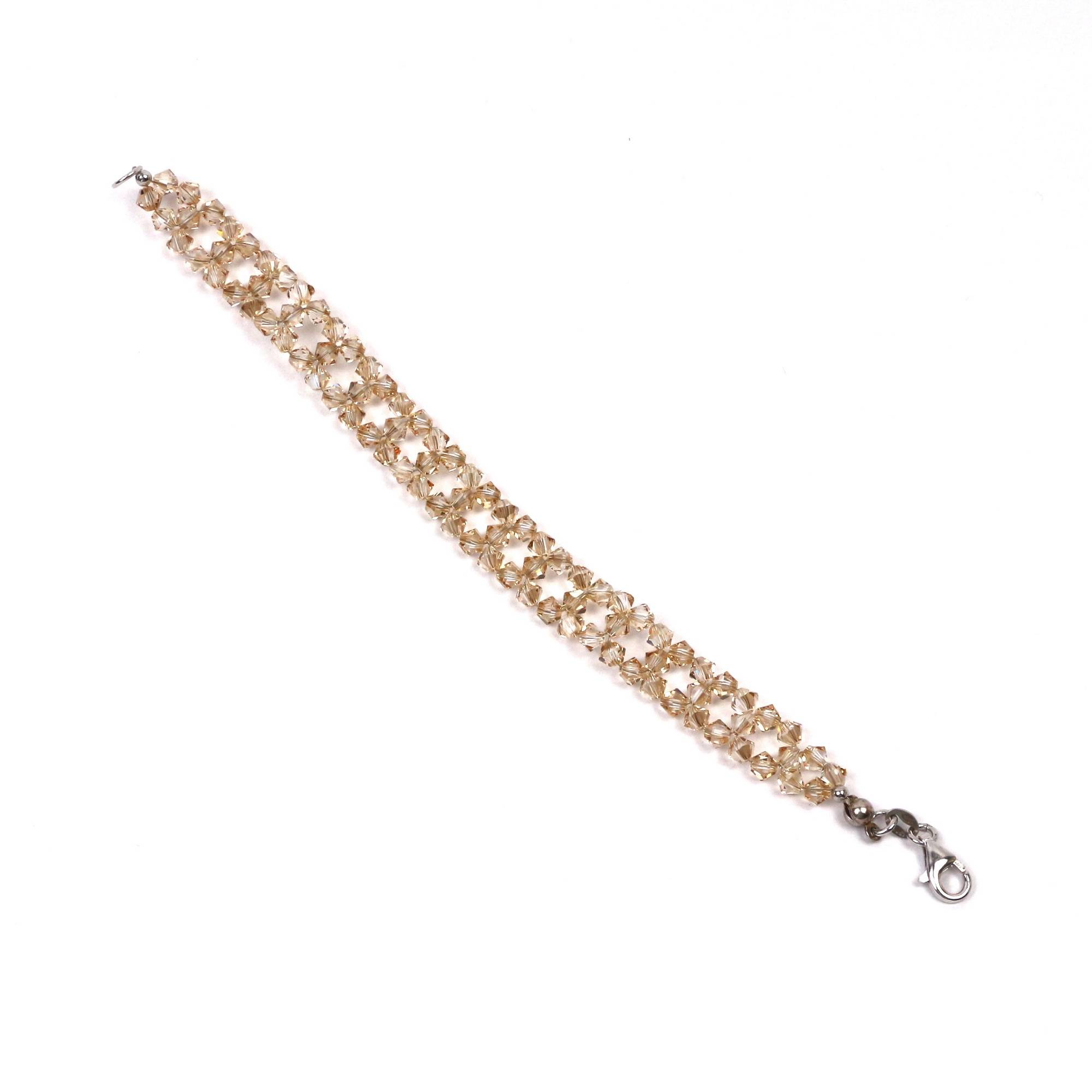Bratara este realizata din elemente de argint 925 placate cu rodiu si cristale Swarovski margele biconice golden shadow de 4mm, avand dimensiunea de 19cm . Bratara se livreaza intr-o cutie de bijuterii cadou.