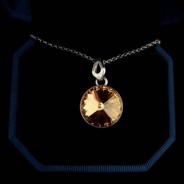 Pandantul este din argint 925 rodiat cu cristal Swarovski rivoli, light siam, de 8mm, are dimensiunea 2 x 1 cm. Lantisorul este din argint 925 rodiat, grosime 1.1 mm si lungimea de 40 cm. Pandantul se livreaza intr-o cutie de bijuterii cadou