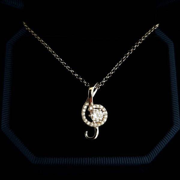 Pandantul cheia sol este din argint 925 rodiat cu mici zirconii crystal si are dimensiunea 1,8 x 0,8 cm. Lantisorul este din argint 925 rodiat, grosime 1mm si lungimea de 45 cm. Pandantul se livreaza intr-o cutie de bijuterii cadou.