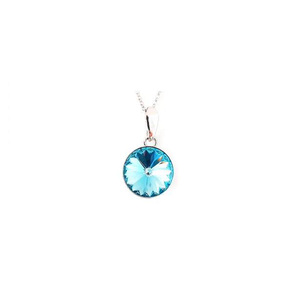 Pandantul este din argint 925 rodiat cu cristal Swarovski rivoli light turquoise de 8mm, are dimensiunea 2 x 1 cm. Lantisorul este din argint 925 rodiat, grosime 1.1 mm si lungimea de 40 cm. Pandantul se livreaza intr-o cutie de bijuterii cadou.