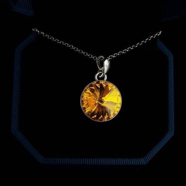 Pandantul este realizat din sistem prindere de argint 925 rodiat, baza rivoli de argint 925 rodiat si cristal Swarovski rivoli sunflower 14mm, avand dimensiunea 2,5 x 1,4 cm. Lantisorul este din argint 925 rodiat, grosime 1mm si lungimea de 45 cm. Pandantul se livreaza intr-o cutie de bijuterii cadou.