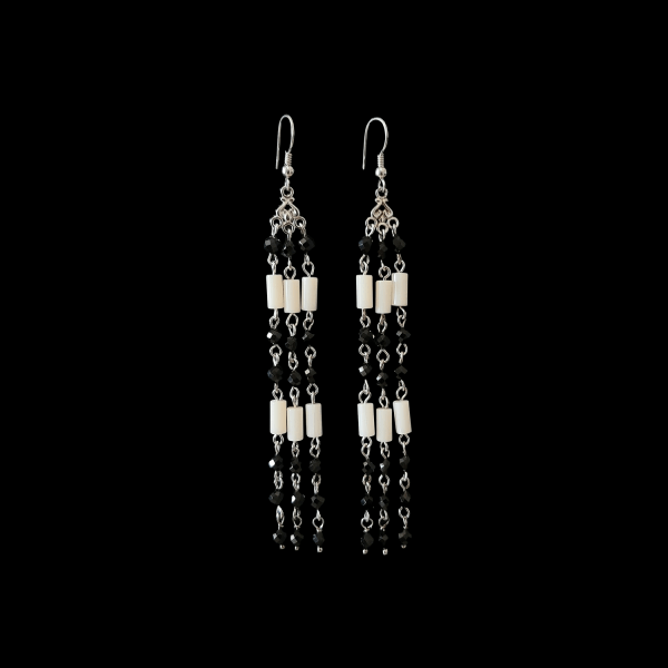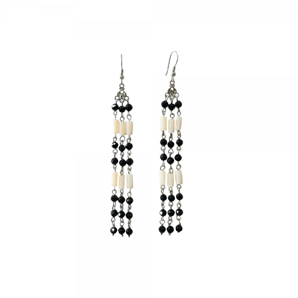 Cerceii sunt realizati din tortite clasice de argint 925 rodiate, elemente de argint 925 rodiate si piatra naturala spinel negru rotund fatetat de 4 mm si coral alb tub de 4x12mm, avand dimensiunea 10.5 x 1,2 cm si greutatea de 6,41 gr/buc. Cerceii se livreaza intr-o cutie de bijuterii cadou.
