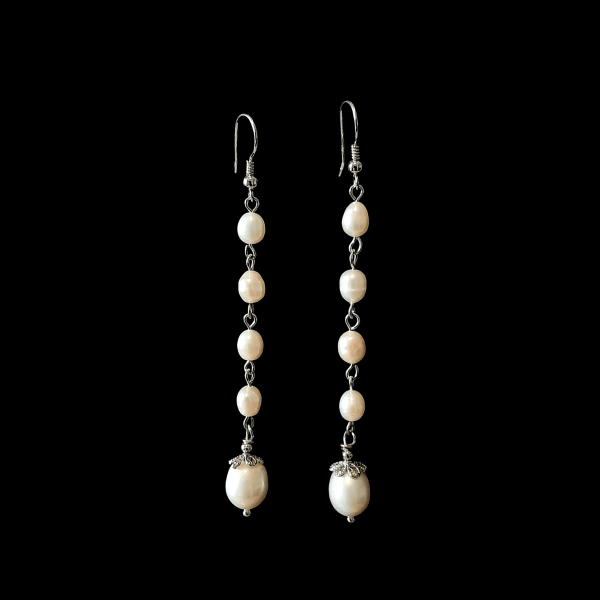 Cerceii sunt realizati din tortite clasice de argint 925 rodiate, ornamente argint, perle de cultura albe de 6x8mm si 8x10mm, avand dimensiunea 85 x 8 mm, greutatea 3,16gr/buc. Cerceii se livreaza intr-o cutie de bijuterii cadou.