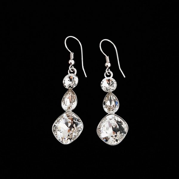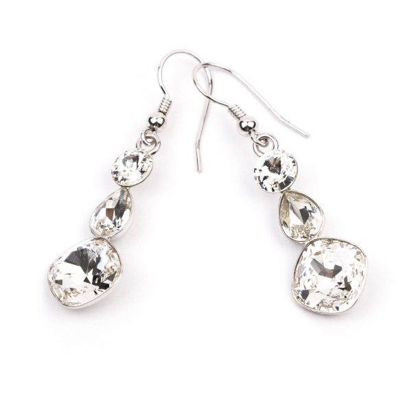 Cerceii sunt realizati din tortite clasice de argint 925 rodiate, baze de argint 925 si cristale Swarovski fancy square crystal de 10mm, picatura crystal de 8 x 6 mm si rivoli de 6 mm crystal, avand dimensiunea 45 x 10 mm. Cerceii se livreaza intr-o cutie de bijuterii cadou.