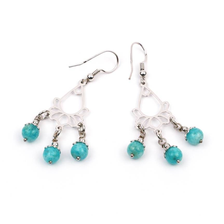 Cerceii sunt realizati din tortite clasice de argint 925 rodiate, candelabru de argint925 si ornamente argint, amazonit rotund de 6 mm, avand dimensiunea 50 x 15 mm. Cerceii se livreaza intr-o cutie de bijuterii cadou.