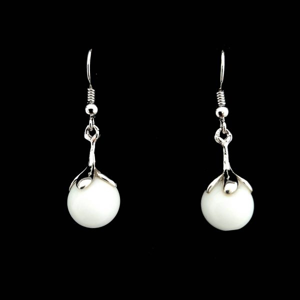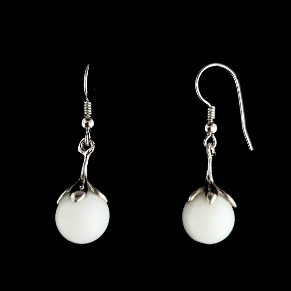 Cerceii sunt realizati din tortite clasice de argint 925 rodiate, sistem prindere floare de argint 925 rodiat si jad alb rotund de 10 mm, avand dimensiunea 35 x 10 mm. Cerceii se livreaza intr-o cutie de bijuterii cadou.