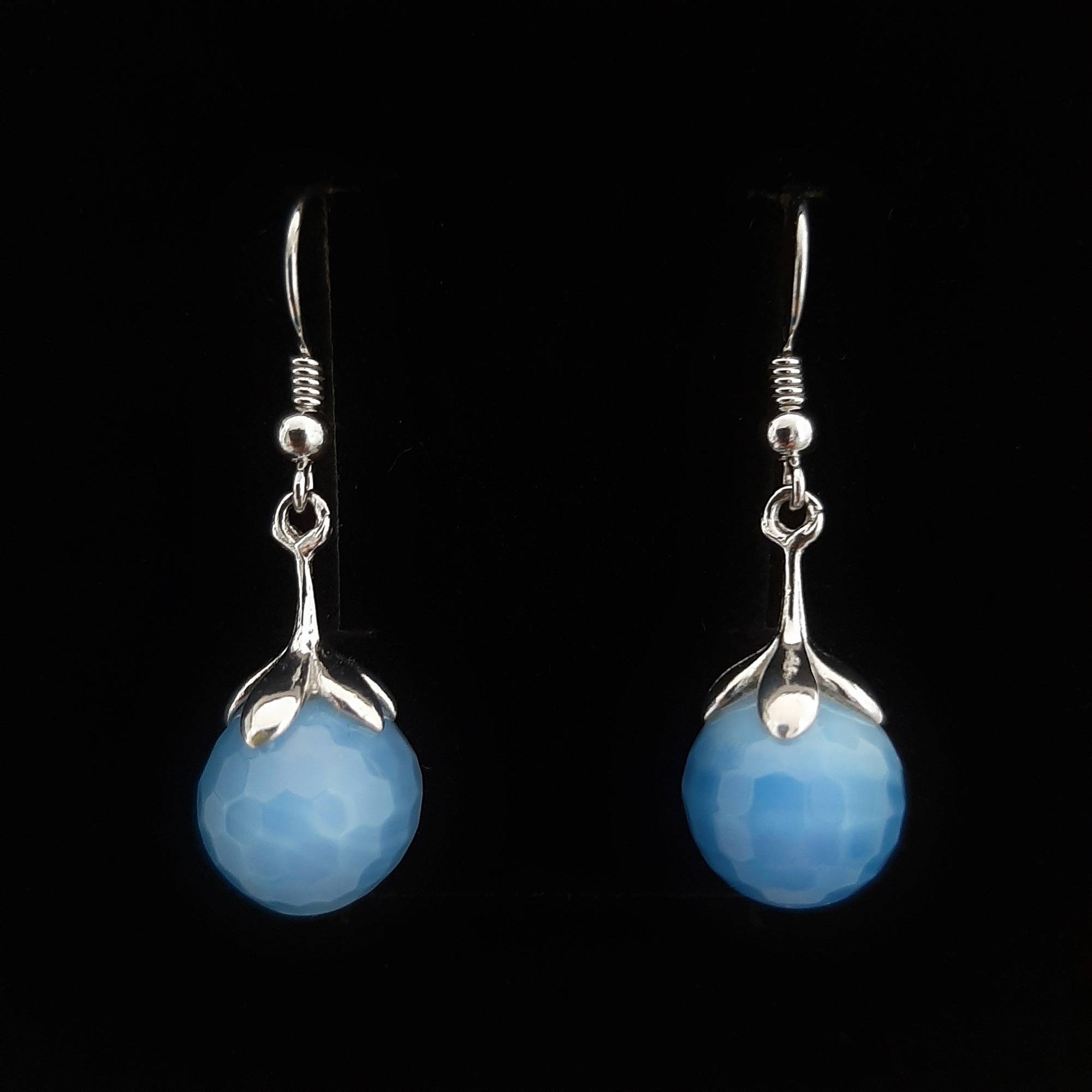 Cerceii sunt realizati din tortite clasice de argint 925 rodiate, sistem prindere floare de argint 925 rodiat si jad albastru rotund fatetat de 12 mm, avand dimensiunea 36 x 12 mm. Cerceii se livreaza intr-o cutie de bijuterii cadou.
